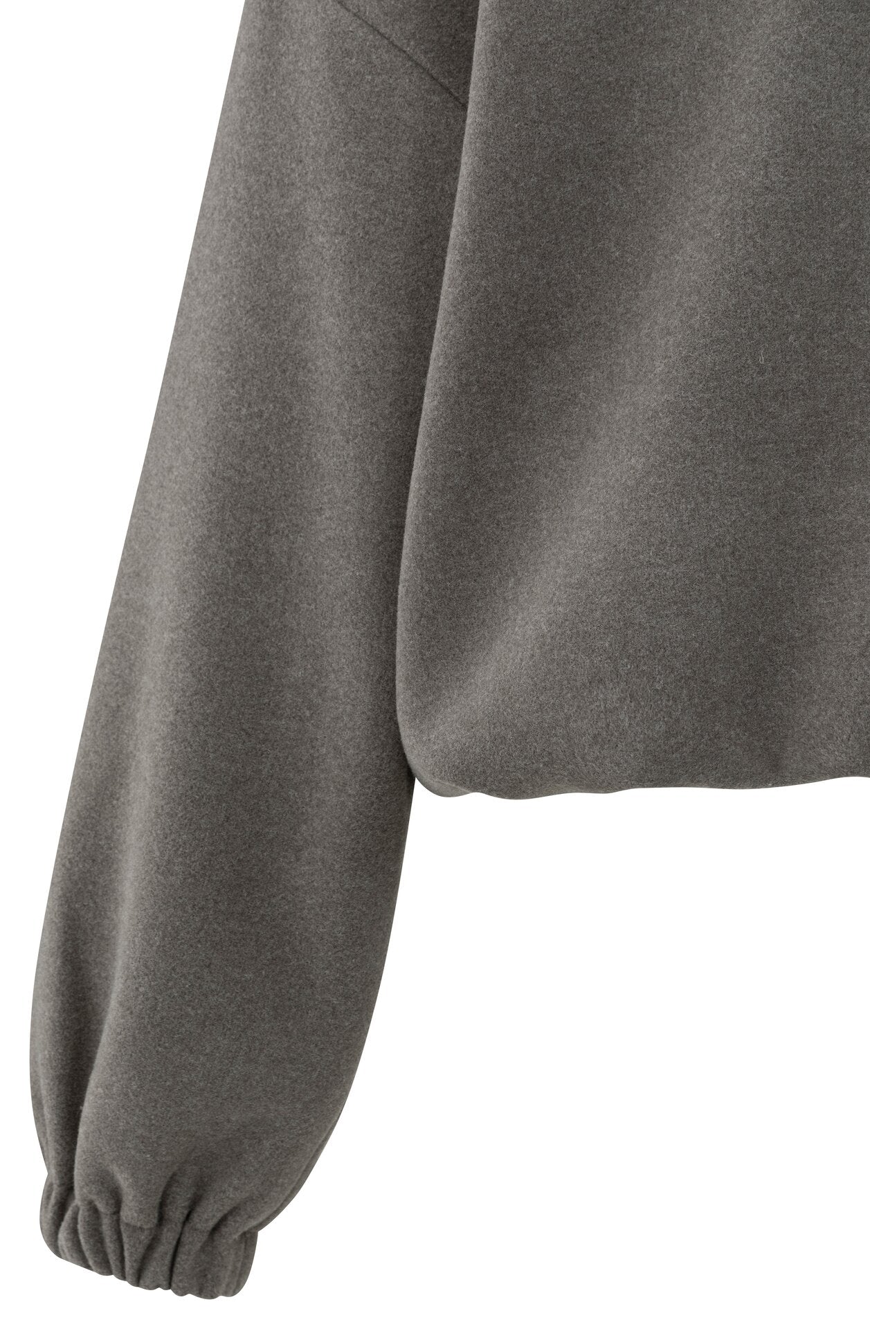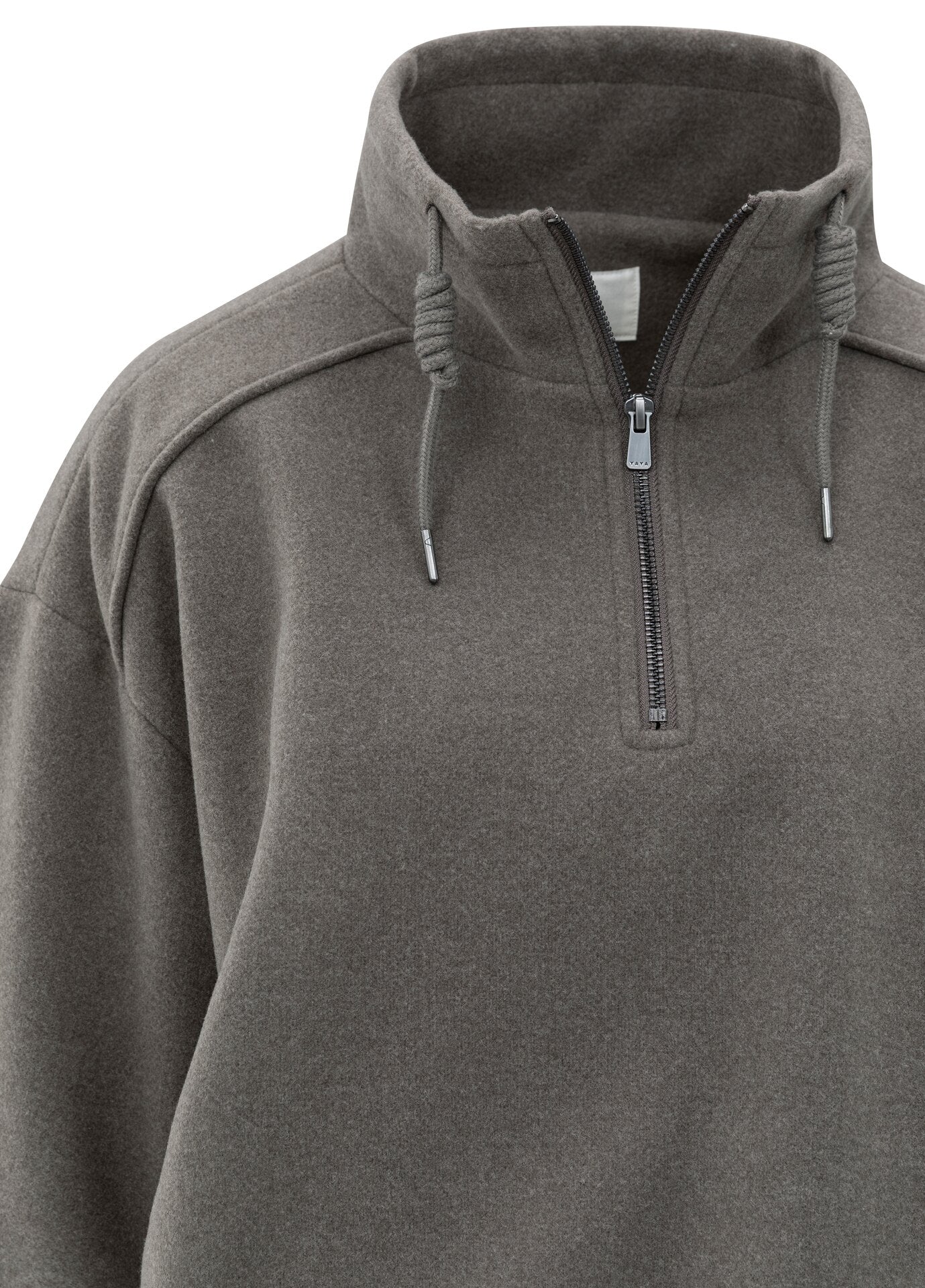 - hat einen hohen Kragen mit Reißverschluss und überschnittene Schultern